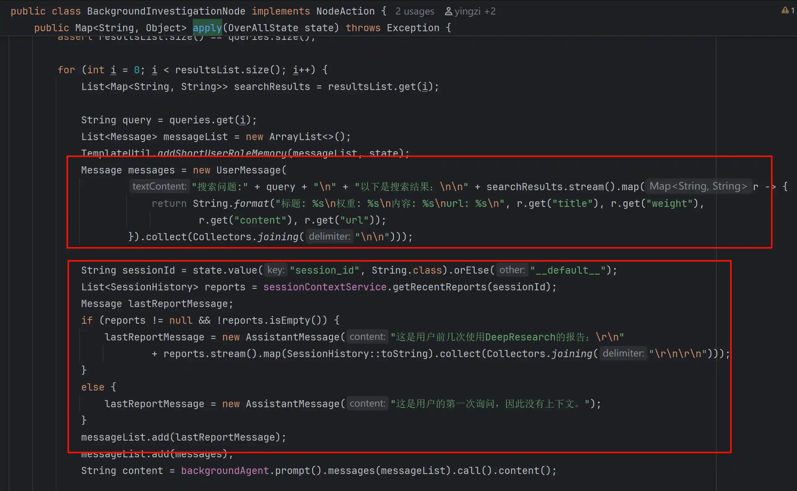 获取到搜索结果之后,将会将这些搜索信息作为side info(辅助信息)交给大模型,具体实现上的表现为,组装了隐式组装了一个UserMessage,整个历史的报告信息一起输入给背景调查Agent处理