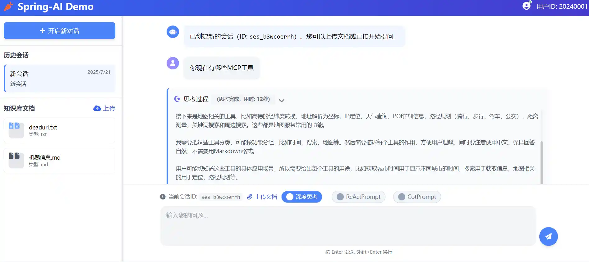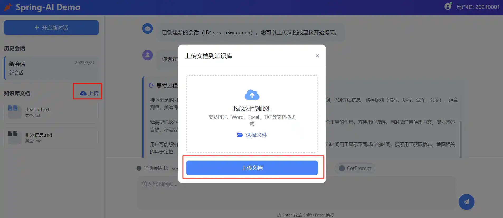 左侧包括已经上传文档的列表,以及开启新的对话,每个对话都是用新的seesionId