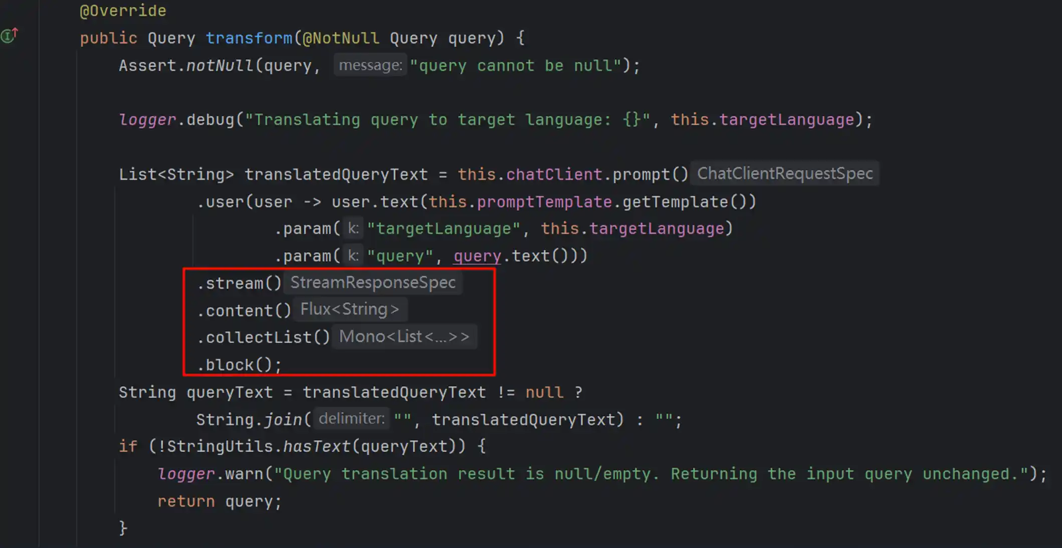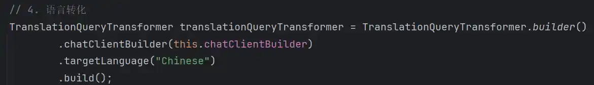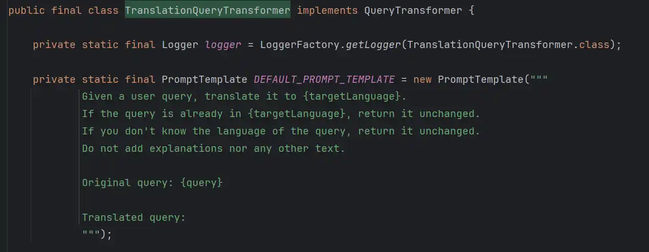 通常来讲,Spring AI内置的Transformer都是以定制Prompt的形式实现的,其中还需要过一遍大模型的交互,以TranslationQueryTransformer为例