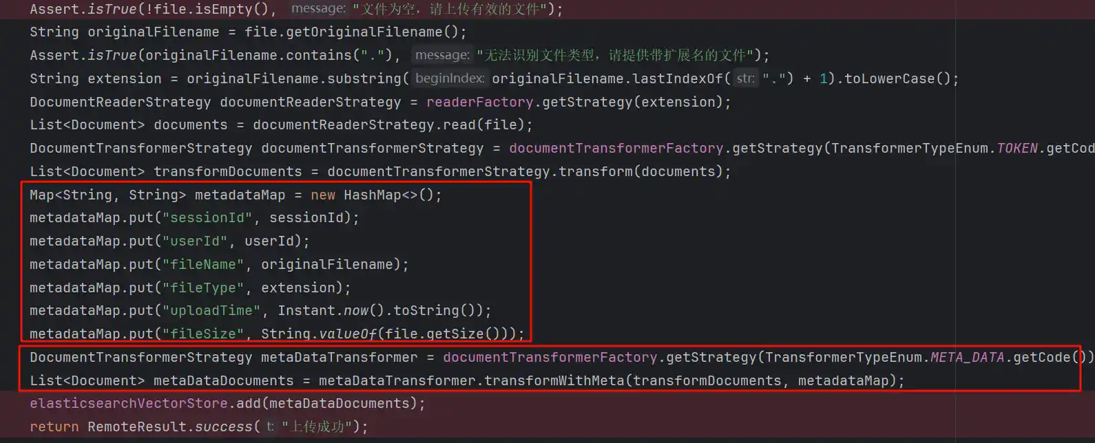 上传文档时调用接口/file/import/documents,参数为file,userId,seesionId