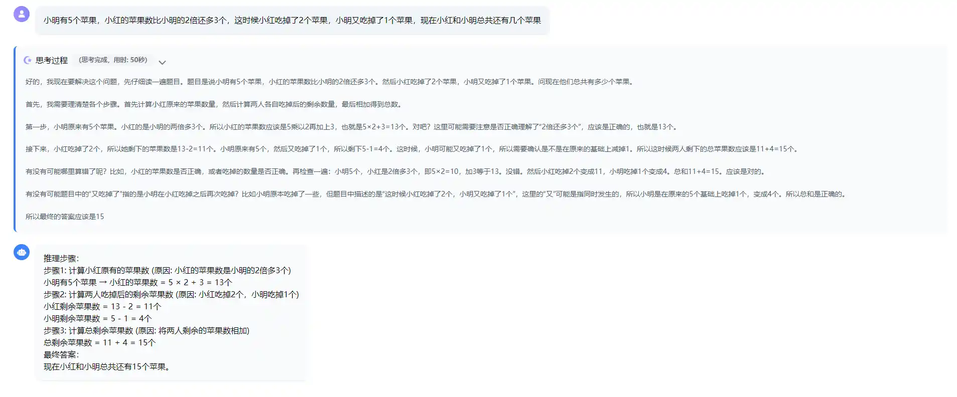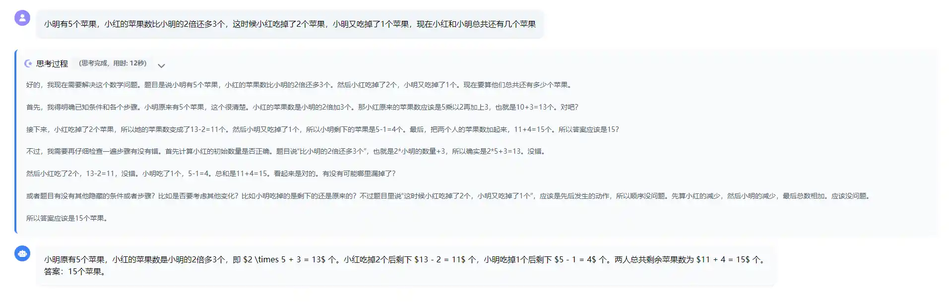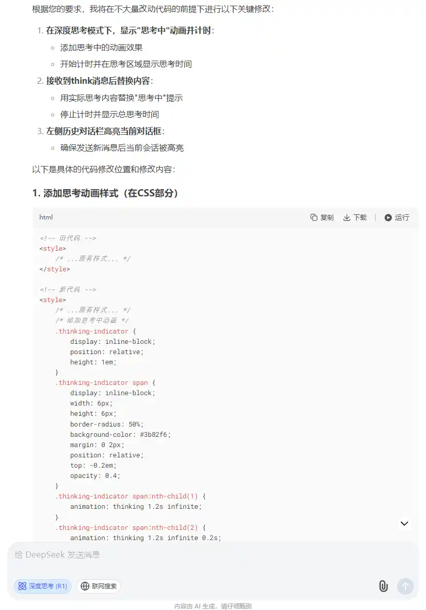 为了更好的用户体验,在收到后端流式消息前,思考区域就默认显示思考中,并加上一定的动效,开始计算并显示思考时间