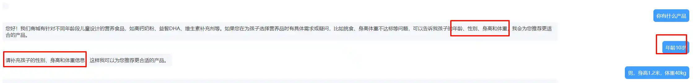 模型侧收到消息后,判断出条件不够充分,要求补充性别、身高、体重然后才能进行推荐