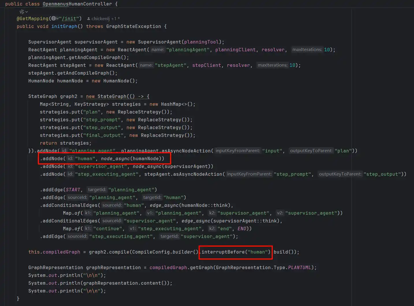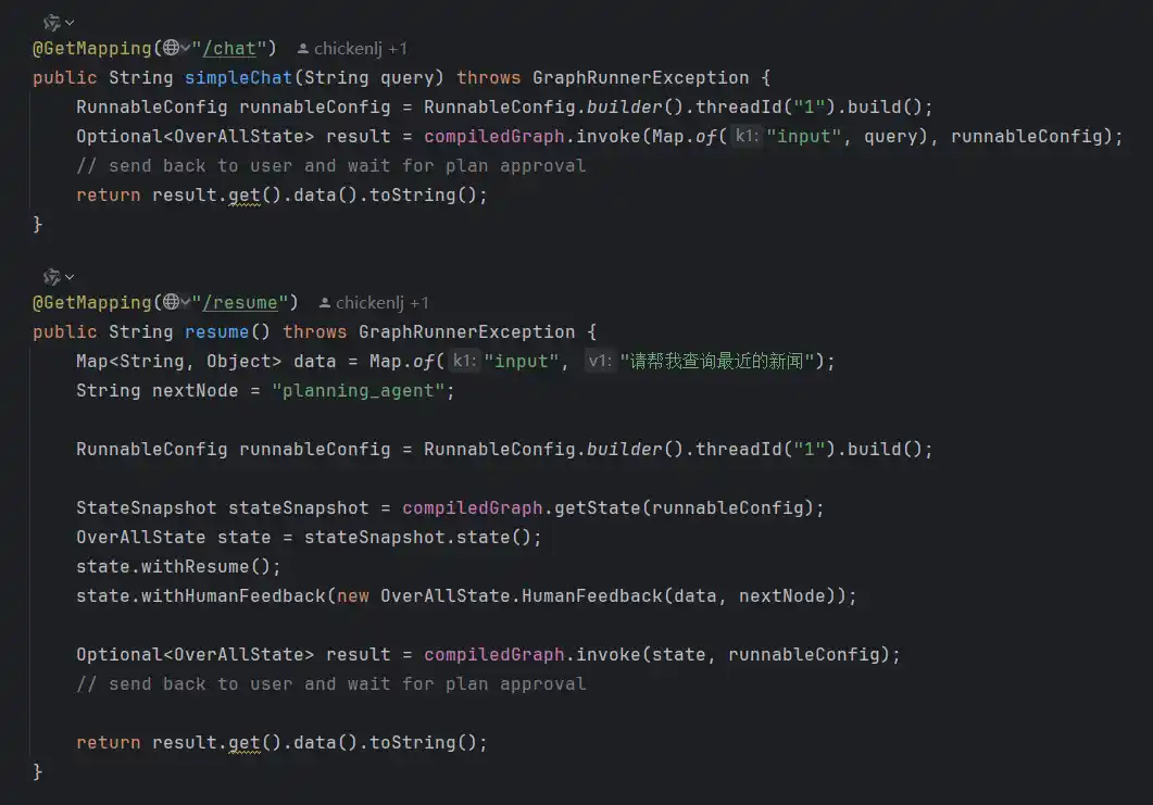 这部分的样例代码只能参考spring-ai-alibaba下的deepsearch、jmanus等项目,或者example的仓库来进行学习,整体来说分为2个接口,一个接口用来chat调用,另外一个接口用来恢复断点。